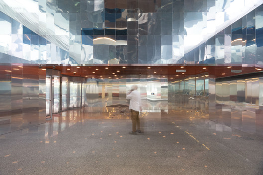 The exterior of the building is streamlined with mirrored aluminum cladding to emphasize the industrial nature of the services offered. The bright surface creates a focal point which is used to attract visitors travelling by car along the adjacent highway. The front façade is lined with louvers that protect the building from the harsh southern sun. The louvers are oriented in two directions using two colors; silver mirror and Credit One’s corporate orange; this generates playful reflections off of the façade, changing the image of the building as the cars passing by change speed and direction. The building also shines at night; it is kept lit from the inside, symbolizing modernity and innovation.
