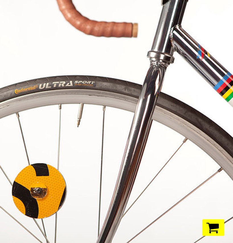 each of these one of a kind works come from recycled road signs. available in both wheel and rear reflector forms, they will protect the rider in the night.