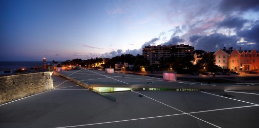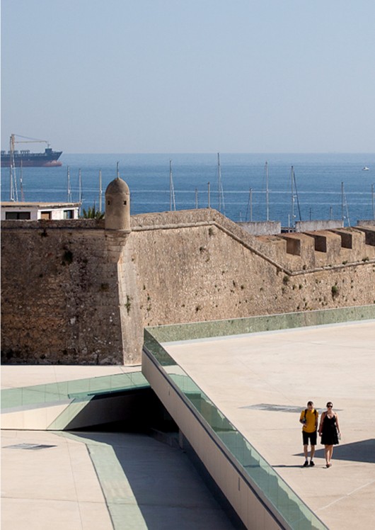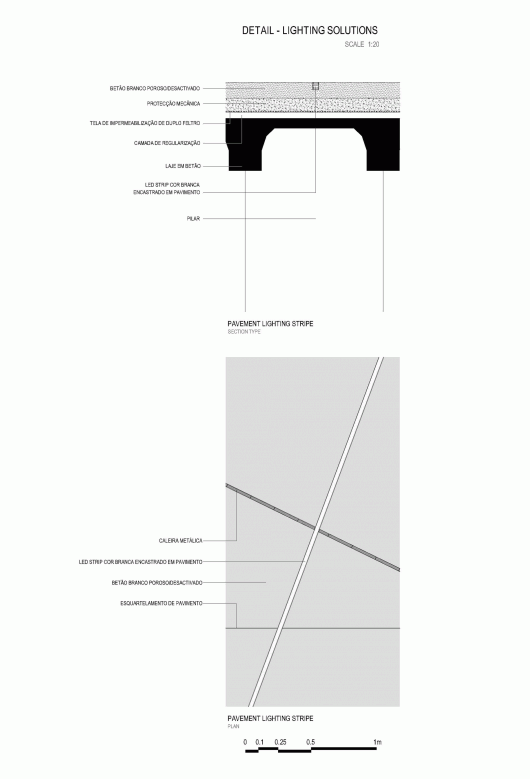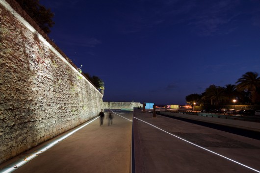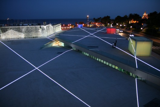 Knowing that light plays an important role in architectural composition, namely when it is applied to buildings or constructions with a relevant urbanistic location, a special attention was given to the lighting presence throughout the fortress stonewall, as to the square surface and the translucid staircase boxes that continuously change colour. To value even more the surface square as a public space, it was chosen not to introduce the park lamps but to draw fine luminic led strips in the white concrete floor, recovering the ancient image of the navigation maps.