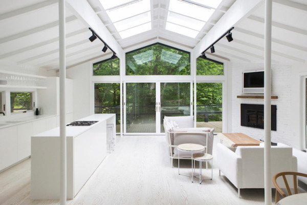 Red Dirt Road is a home in East Hampton, New York designed by architect Amee Allsop with a clean, white interior that looks out onto the green wooded lot. Extra wide, local Douglas floor boards were bleached and finished off in a white wash which brings texture to the surrounding white surfaces.