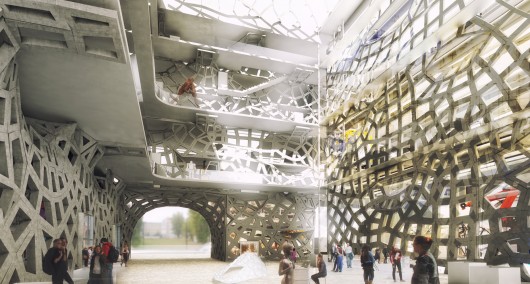 The overall form of the structure is derived by beginning with basic geometries and manipulating them according to structural efficiency, with a technique known as “positive casting” used to conserve resources and to produce the design’s unique elements and geometries.
