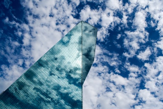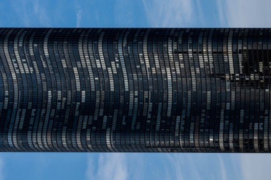 The Lake Point Tower holds its own among various more famous buildings around it, with a unique curved shape that obscures and flattens its three actual sides down to seemingly two. This dark glass structure resembles a monochrome version of the opening scene from The Matrix movie, with flowing rectangles and unexpected reflections and gradients. It once held dual world records for both being the tallest apartment building yet shortest one to extend to seventy floors.