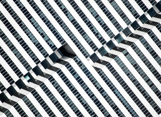 A rare building that is diagonal to the usual angles and regular intersections in the densely packed downtown Houston, its hypnotic lines roughly match some of the elevator shafts from inside the building, moving office workers and lawyers around since 1981. Adding to the mesmeric feeling to this architecture are the intense black and white lines, focusing on glass and aluminum in a city known for oil or concrete.