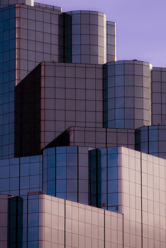 A rare landmark that is most recognizable at night, this modern structure’s edges are lined with high-powered light tubes that outline the unique shape and make it visible for miles down the many highways that intersect in its proximity in downtown Dallas. The complex saturated intersection of glass and steel adorn two of the four sides of the building, with this west-bound one providing the most captivating color pallets and sharp, warm angles.