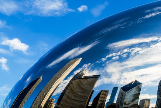 Borrowing from the very concept of mirrors, the Cloud Gate sculpture at Millennium Park in downtown Chicago can be explored and approached in infinite ways. The Bean, as it is colloquially known, can be photographically viewed from any angle, providing visitors full access around and under it, and allowing for creative combinations of light, sky, clouds and the city’s reflection. Looking north-east towards it from Michigan Avenue, The Bean imagines what might be if the winds in the ‘Windy City’ were infinitely strong.