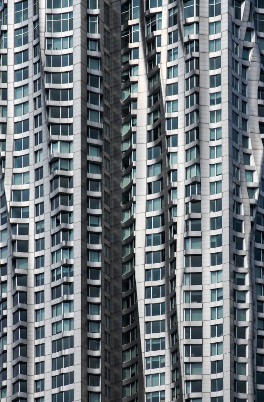 An important part of the beautiful westside view of New York City is Frank Gehry’s glass-heavy IAC Building. It is his first design completely covered in glass, using a method that cleverly obscures the divisions between floors, with 1349 unique panels imported from Italy. Lined up behind it across 19th street which separates the two buildings is another glass-heavy building perfectly complementing the saturated visual space of the two structures as viewed from the narrow sidewalk alongside the busy and loud 11th Avenue.