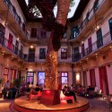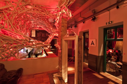 Doboz Bar was built in a building where the facade is under heritage protection. The bar’s name (meaning ‘box’ in Hungarian) is a reference to the installation in the middle of the old building’s courtyard, which has the shape of a hangar. The static atmosphere of the installation is challenged by the sculpture of Gabor Miklos Szoke, a wooden King Kong piece that is climbing up the patio’s 250 years old tree. The graphic design seen in the walls of the building were created by Eszter Laki. The venue can hold as many as 1000 guests, and the vision of 81font was to create a new type of cultural center. The squat party atmosphere of Doboz Bar is partly due to the presence of the original door frames. The floor is made of old oak, while the architects re-used as many of the original materials found in the house as possible. The lumbers of the loft are part of the installations in the grill bar, while the restrooms were created using the old doors found in the house and covered with 100 years old Zsolnay porcelain. A huge part of the furniture came from the city’s flee markets based on a firm design concept. A strong part of the idea is how the creators are using lights to create a unique atmosphere.