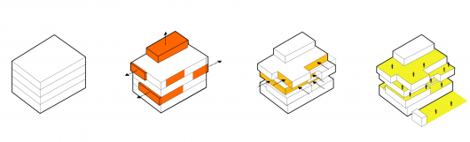 A compact volume in which levels slide to each other to develop exteriors spaces to every levels. The aim of the project is the stack of functions while giving each of different grades of use.