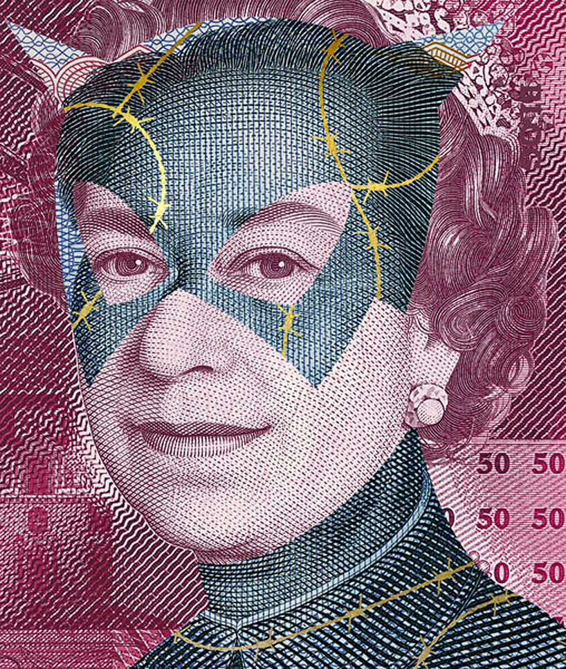 by reworking selected parts if the U.S dollar bill, british pound sterling and yuan/renminbi banknotes, rabatti has formed series of altered figures which aim to incite a discussing about the current economic crisis.