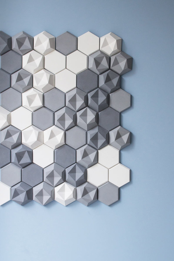The three dimensional tiles have asymmetrical surfaces that look faceted, thanks to the concave and convex planes.