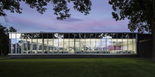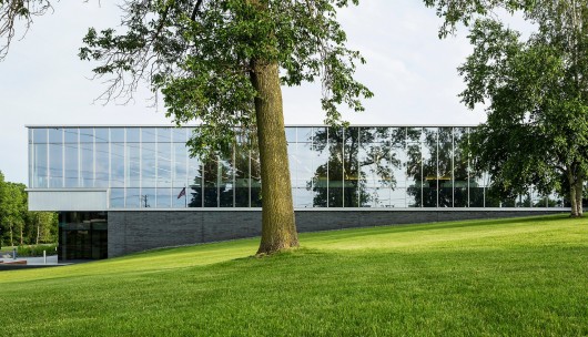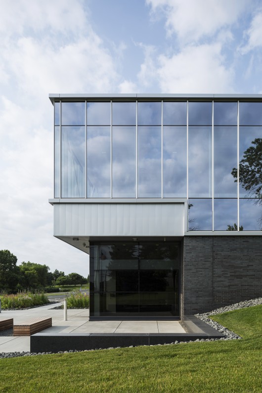 The lightly reflective glass mirrors the lake, lawn, and trees along the east, north, and west façade. The new curtain wall volume is surrounded by a silver aluminum trim element that folds up and down to frame building entries and the east facing dining terrace. The upper level glass volume hovers lightly over a dark iron-spot brick base that mediates between glass and ground and negotiates the grade change along the north elevation.