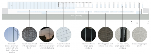 The existing masonry base was constructed of an uninsulated single wythe concrete masonry wall with direct applied buff colored brick. The renovated wall extended the building foundation 8” to add insulation, air space and construction of a true cavity wall of dark brick. A continuous ribbon of glass at the base is set co-planar to the brick to visually fuse with the dark base. Subtle changes in brick coursing add a level of refinement at building entries.