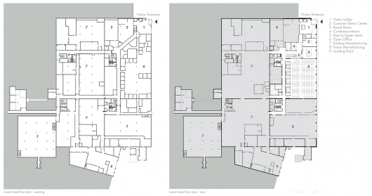Emerson Process Management is housed in three combined manufacturing/office buildings in the southwest suburbs of Minneapolis, Minnesota. The existing Eden Prairie facility is an aggregation of multiple building additions constructed between the years 1964 to 1991. Designed to dimensions ideal for large manufacturing floor plates, the main volume of the building is a two-story 300′ x 400′ rectangle set into sloping grade. The full height two-story volume is expressed on the east elevation while only the upper level is visible to the west.
