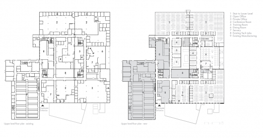 The 120,000 square foot building footprint, ideal for manufacturing, poses challenges for office workplace environments. The design goal was to provide daylight and view to all office spaces by accepting an internal circulation loop inset 95′ from the new curtain wall. Areas adjacent to glass curtain wall were dedicated to open office environments with low proportioned workstations with glass dividers. Glass-fronted private offices were located inboard just inside the circulation loop. On the interior of the circulation loop, programs include glass fronted conference rooms, testing labs, training rooms, vertical circulation, toilets, and building mechanicals.