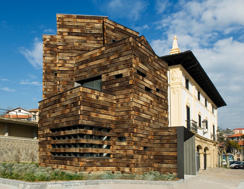 in the town of azkotia, the irregularly shaped extension has been clad in wooden railway sleepers- referencing the building’s previous use.