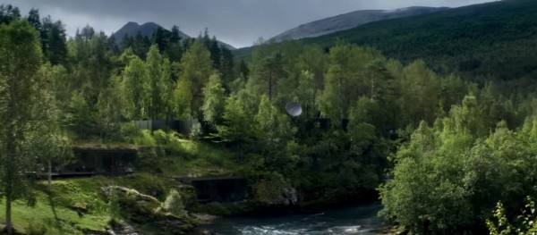 Much of the home used in the final film is actually a hotel. The Juvet Landscape Hotel, from the Norwegian team at Jensen & Skodvin Architects. Although the film takes place in Alaska, this stunning hotel is actually found in a remote area of Norway. The hotel, which has not been open long, is nestled among rocks, forests, and water. It plays the part of the billionaire’s dining room but is also available for booking – if you can afford it.