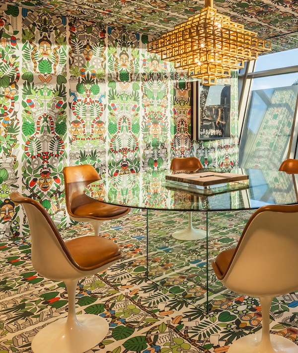 Imagine working in this office! For a design project in the southern African nation of Angola, the interior designers smartly merged floor treatment, wall treatment, and ceiling treatment into a seamless interior with a strong Mid Century bent—thanks to Archives, a highly illustrative modern wallpaper pattern by Antwerp’s Studio Job (see our previous editorial on Studio Job’s Archives wallpaper here) By opting to use Archives’ densely packed ornamentation in an all-over application, the designers turned a simple box of an office into an exuberant extravaganza of pattern that complements the purity of a transparent conference table, Mid Century credenza, and the fluid simplicity of Knoll’s Tulip Armless Chairs. It’s a daring visual feast—but just try getting any work done!