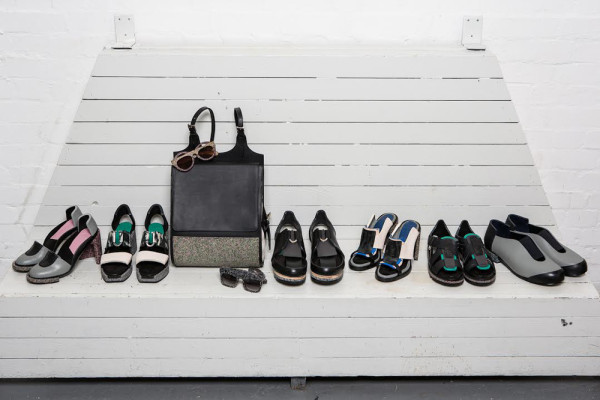 White has taken the discarded leather from manufacturing processes and architectural materials and reconstituted them into a stiff, stone-like material. Then, the ‘new’ leather, coined BitLeather, is transformed into shoes, backpacks, footwear, and even eyewear. The collection is characterized by monolithic forms and sculptural elements, creating a strong, architectural presence on the wearer.