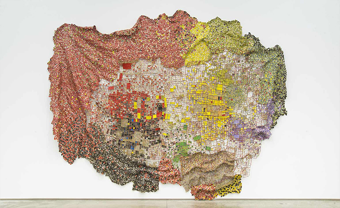 Anatsui uses resources typically discarded such as liquor bottle caps and cassava graters to create sculpture that defies categorization.