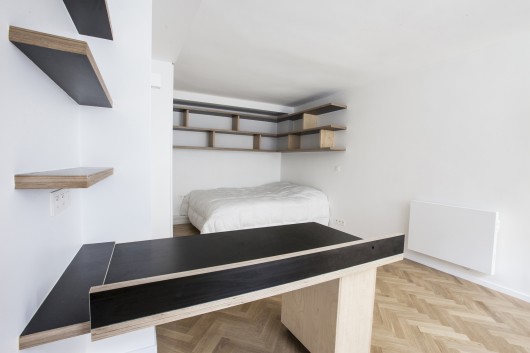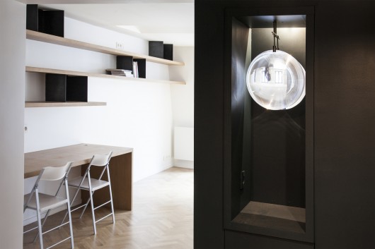 From the architect. Initially, the flaws stood out in this 19th-century Parisian flat located near the Place de l’Opéra. This single-aspect flat has low ceilings, and load-bearing walls connect all the rooms, making major changes impossible. A poorly lit, narrow, winding entry hall led to the living room that then opened onto a kitchen and then onto a bathroom/bedroom. When the client, a photojournalist, bought the flat, it was unfit for habitation. He wanted a modern, simple space, an additional bedroom and a multi-usage living area acting as a living room, dining room, kitchen and office.