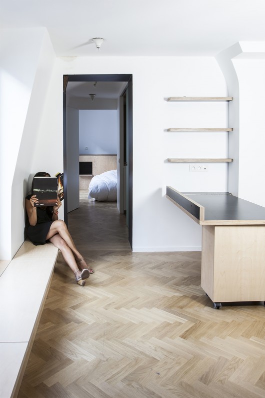 The next room is a library/guest bedroom, which is separated from the owner’s bedroom by a bathroom. In the guest bedroom, a retractable desk folds up against the wall to free up space when it is not being used. A bench that can be opened for storage also acts as a step for reaching the balcony. The door frames leading from one room to another along the front of the flat have also been painted in midnight blue in order to reinforce the flow of rooms from the living room.