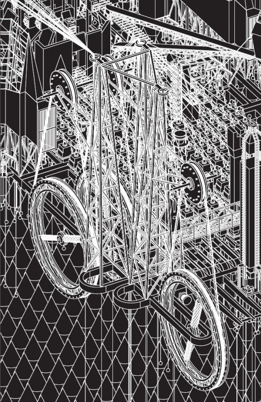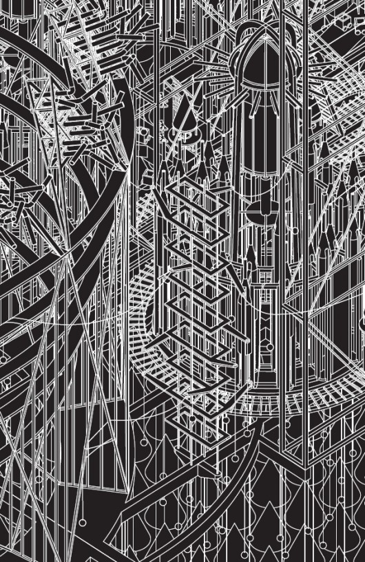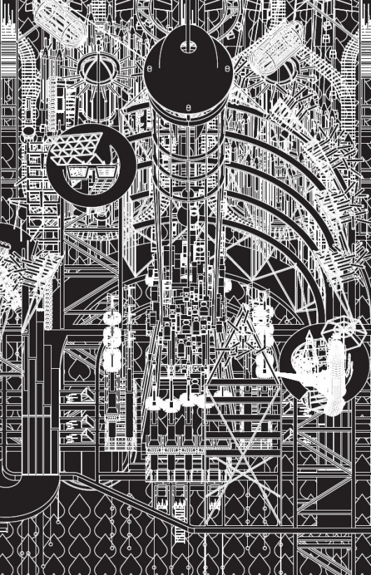 There are no direct references to the Tales – instead the imagined city consists of evocatively named structures including the Silver Forest, the Barometer and the central Morning Star, casting light and shadows all round the city. Running over with details, arcane and entirely compelling, FleaFolly easily rival centuries of painting of illustration of the Grimm Fairy Tales.