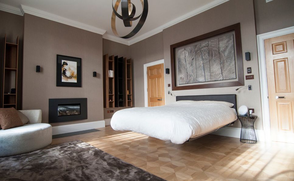 Installing a floating bed in a larger space plays up the modernist and openness of the room. Here, the patterned wall keeps the bedroom from feeling too stark.Here’s an example of a floating bed without a headboard. Because the space is more compact, the lack of a headboard or posts give it a more open feel. Even without under lighting, the bed seems to float.