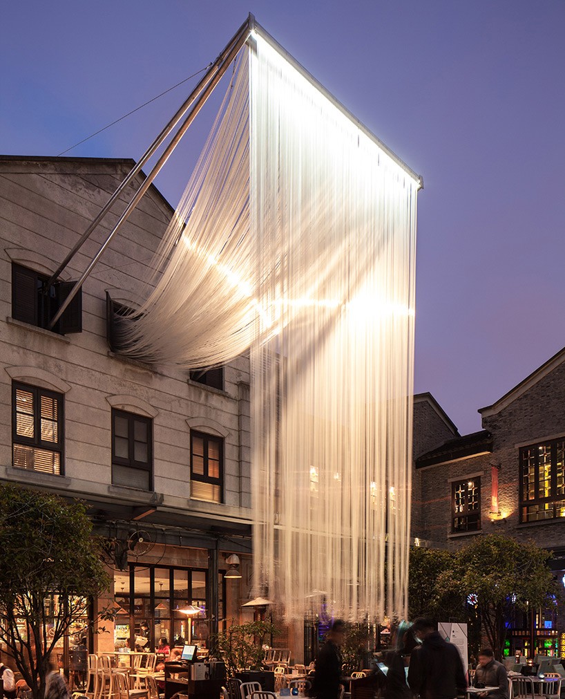 30,000 meters of translucent cord spill from the upper windows of the fountain restaurant in, shanghai’s xintiandi district, for RIBA’s windows project 2015.