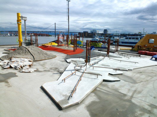 In the third phase, the surfaces and installations were created using recycled and reshaped elements from petroleum installations, the abandoned Frigg oil platform, offshore bases, equipment suppliers and scrap heaps. The selection of elements and materials was done together with youth groups visiting the industrial sites outside the city center. Some installations are borrowed from companies, some were given and other were bought cheap as scrap. The park is extensively used by kids, parents and youths at all hours, turning the formerly abandoned site into a humming social meeting point. The park was originally planned for a temporary period of one year, but it is still there five years after and there is an ongoing discussion to make the park permanent.