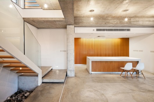 Equivalent details are designed for the interior, with insets in the walls creating horizontal surfaces for objects, devices (television) or for seating, and a shallow pit filled with sea pebbles. The use of concrete on the floor, walls and ceiling gives a public character to the space, with selected surfaces in white becoming accents. In the library, an entire wall becomes a wooden bookshelf, in a configuration that resembles architectural facades.