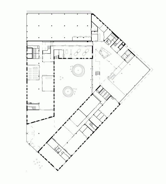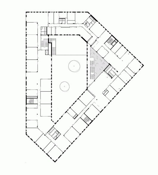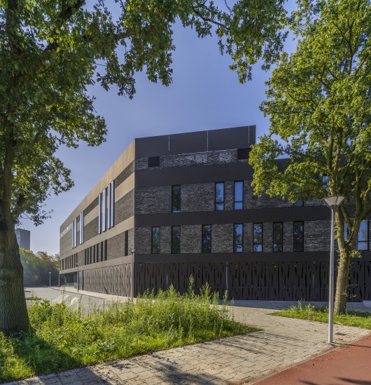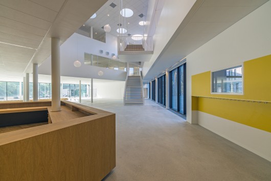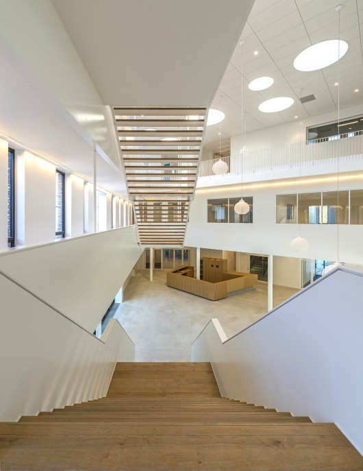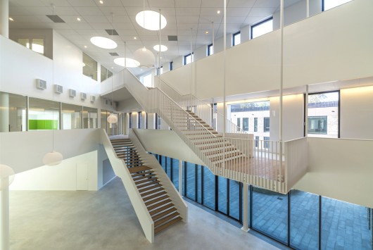 The main and evening entrances are situated at the de parallel road of the Eykmanlaan; this is also the parking zone and the public transport stop. There is direct entrance from the bicycle shed under the building at the northern side: the students’ entrance. In addition to these formal entrances, there is also an informal entrance, via the court. The design has been created in such a way that every entrance leads to the reception desk in the atrium: the heart of the college. This space is divided over three floors. Here, every domain can distinguish itself, and this is the place where all the various users meet each other. Directly situated at the court, in line with the atrium, is the auditorium, which also forms part of the heart.