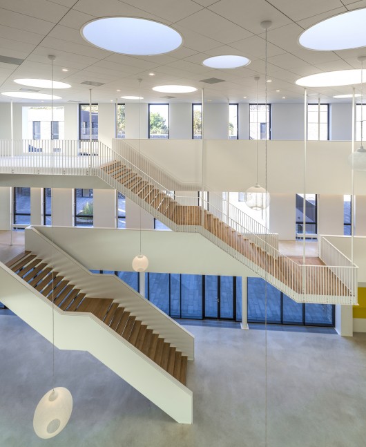 The specific domains Exact and Art & Culture are also situated on the ground floor, which, just as the domain Sport, can be closed off and hired out. On the first floor the more generic domains can be found such as Mankind & Society, Languages and HAVO/VWO 1,2 (senior general secondary education/pre-university education). These domains use the same sort of rooms and can mutually interchange. The domains Sport & Exercise and MAVO (general secondary education) are located on the second floor. All these domains can be reached from the atrium, the main stairwell, without crossing other domains.