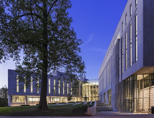Sustainable design principles have informed the design with particular emphasis on the building’s solar orientation and the integration of daylight and views throughout the building. Locally quarried limestone on the building’s exterior continues the campus tradition with accents of vibrant colored stones from around the world making visual reference to the study of global cultures. This rich variety of materials and textures culminates in the interior with a three-story wall of international stones in the central atrium.