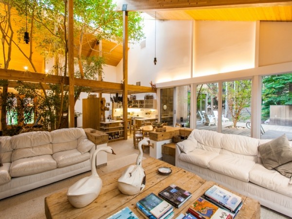 The natural wood throughout the shared living space gives it a timeless rustic feeling while huge windows give majestic views out into the surrounding forests. The architect has even managed to bring the forest indoors with a large planter featuring trees that stretch up to the vaulted ceilings.