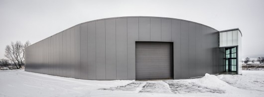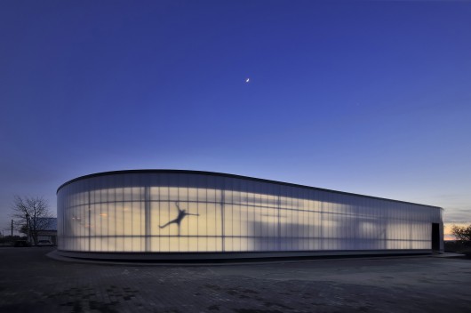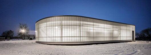 The parchment-like elevation at dusk and at night makes it possible to see the inner life of the building. The elevation is not dead – it works, it changes. A hall is not a lifeless tin block. The organic form of the building is an architectural negation of the rectangular shapes of the halls. A hall without vertical edges in the landscape is read as smaller. This form is less aggressive both for the landscape and for the eye.