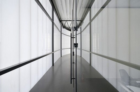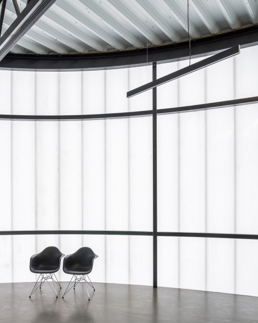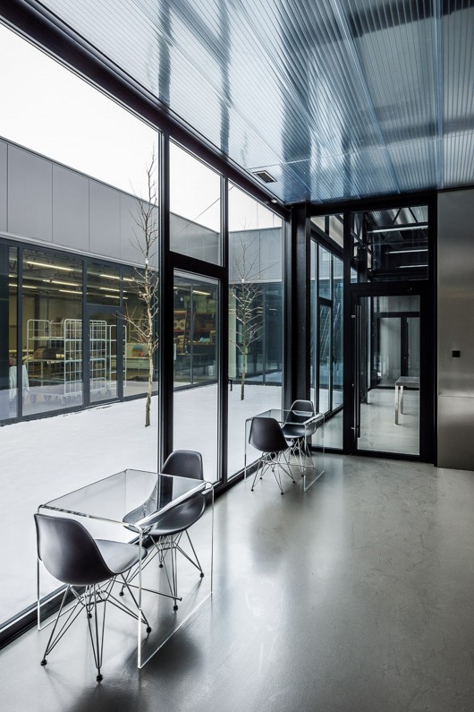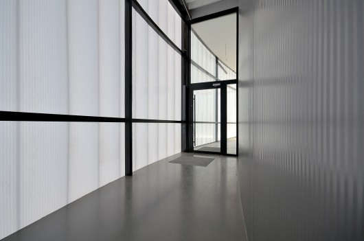 The usage of typical industrial construction materials such as polycarbonate or insulated panels and using them as the materials forming both the exterior and interior of the building was aimed at showing the creative possibilities of these materials. The facade insulated panels forming an oval elevation penetrates inside of the building and breaks several times in its plan forming the interior of building. Multi-layered polycarbonate panel is the dominant material in the interior walls and offices ceilings. These treatments aim to make a strong connection between the building interior, its facade and the outer form.