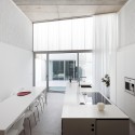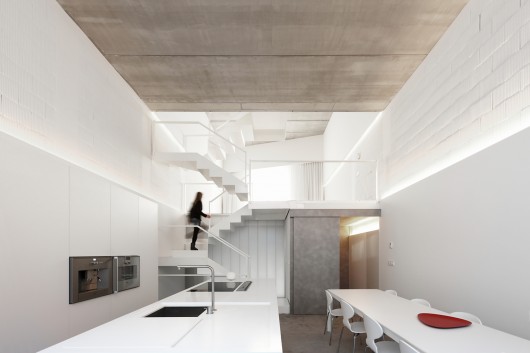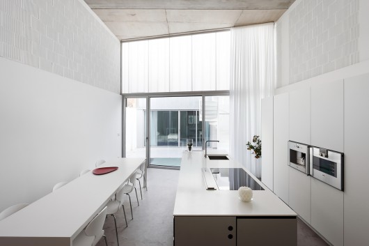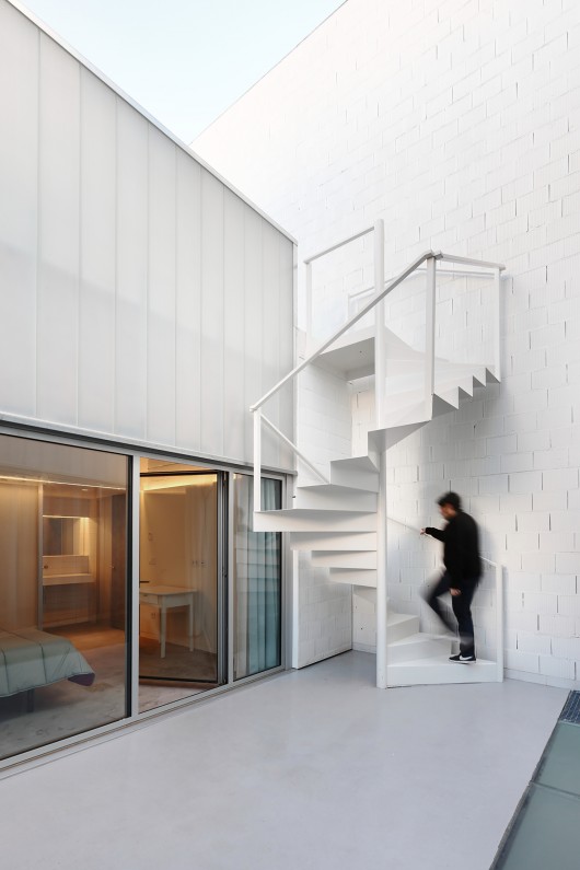 The building maintains the alignment and volume of municipal regulations, with access through a porch that serves as a garage. The living and the kitchen-dining area is used as a single double-height space, which extends onto the courtyard, and provides access to the rear guest annex over which there is a terrace with a small pool.