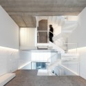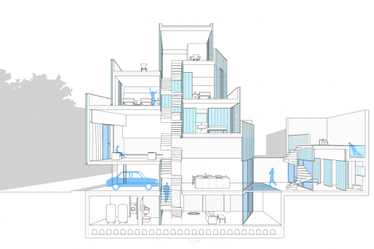 The broken section of the upper levels around the staircase minimizes the horizontal circulations, which turns the staircase into a distributing hall, without the needs for landings and hallways. The rooms are arranged along a privacy gradient with the day program located at the lower levels, and the bedrooms on the intermediate and upper levels.