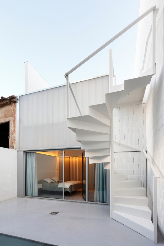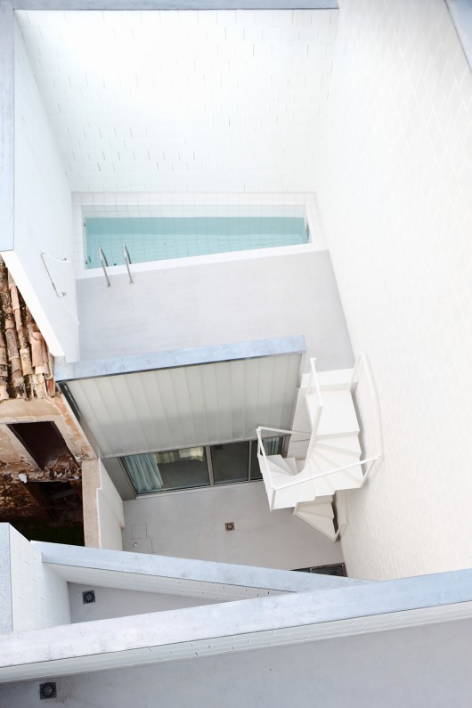 From the architect. The plot between party walls is about 6 meters wide by 25 meters deep. The new construction keeps the current sequence house-courtyard-annex, typical in the historic center of town.