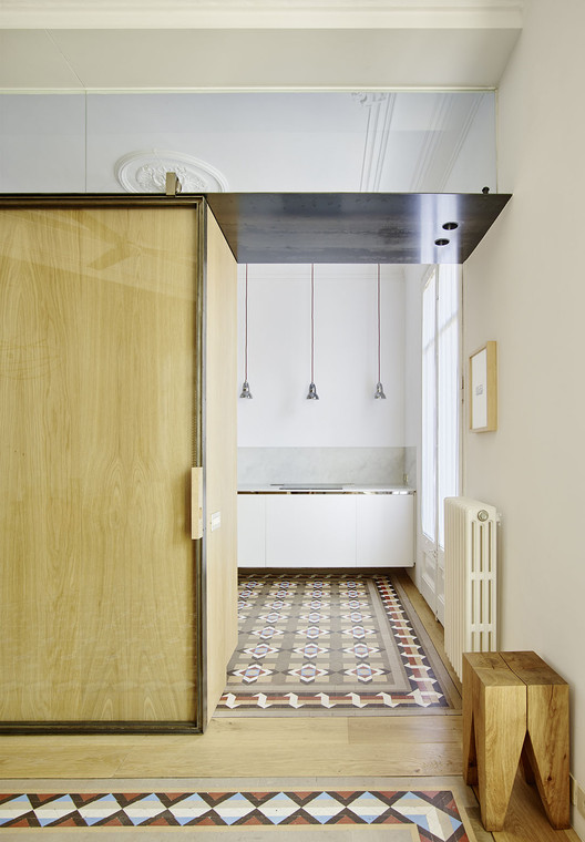 The perimeter of the apartment is completely free by concentrating the intervention in one single and continuous volume that works as a spine. The juxtaposition of regular cells with of colourful mosaics, gypsum mouldings and lush, pine carved doors and stained glass windows is precisely the flexible and polyvalent value of Eixample flats. Such feature allows the user to continuously adapt the distribution of the flat in response to lifestyle requirement. Thus, the house is offered as a blank canvas in which to easily arrange furniture, paintings, art pieces, objects and family mementos cumulated during a lifetime without feeling inhibited or restricted by the new project.