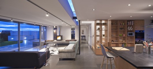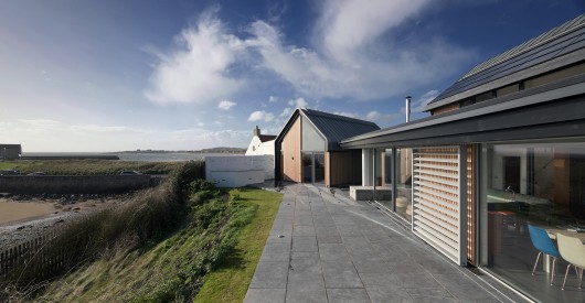 From the architect. This new beach-side house replaces a 1970’s bungalow with a house that engages with its dramatic coastal location and aims to enable its occupants to luxuriate in the special views over the Firth of Forth. The building form is broken in to parts to tie it in with the scale and massing of its vernacular neighbours, with a range of living space with a horizontal sedum- covered roof tying the parts together.