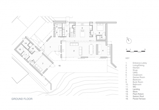 Internal materials are simple and utilitarian with a timber OSB lining to the children’s bothy and smooth concrete screed throughout the ground floor. Part of the main roof is formed in fully integrated solar PV panels which also form the weathering layer. Moving louvre panels enable some control over solar gain at the southern beach frontage. First floor bedrooms look out over the sedum roof, bringing the landscape and seascape right up to the window sills.