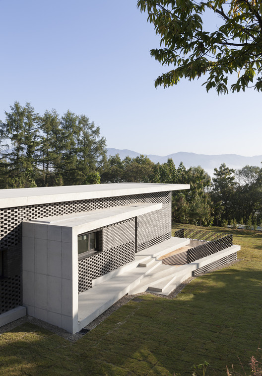 These brick screens are differently stacked by the height of openings and also external lightings are aligned with the height. The balustrade in the deck constructed mimicking the pattern of brick stacking. Oblique slabs are utilized to form eaves, deck and entrance stairs and provide various shapes of shadow all day.