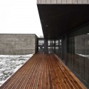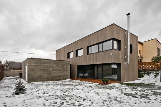 The garage has wooden boards imitation in the concrete walls. The sitting room of the house provides access to a wooden outdoor terrace (architect Antanas Dominas, designer Audrone Dominaite).