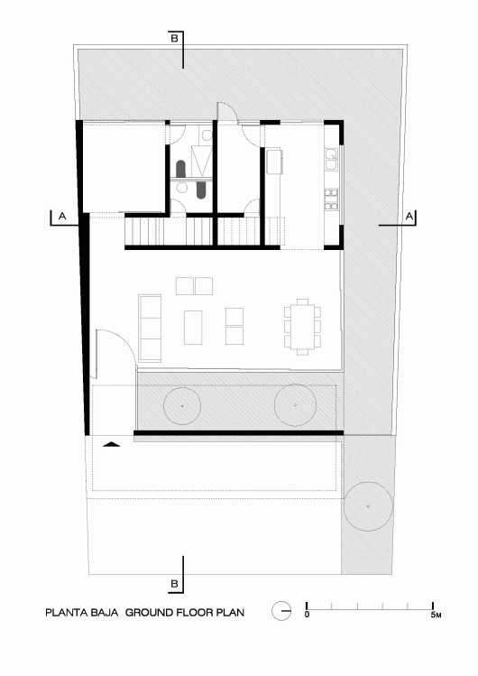 To provide privacy, a concrete screen wall prevents us overlooking the street and garages, creating an indoor garden that becomes the heart of the house. Thus producing a kind of open pavilion surrounded by green. The staircase is hidden behind walls, dividing public and private areas.