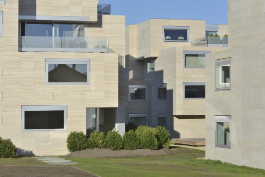 The street view plays with a complementarity principle of subtraction (Group8) and addition (Luscher Architectes) of travertine stone. They form an overall vision following the rules of the urban plan geometries study established by Luscher Architectes.