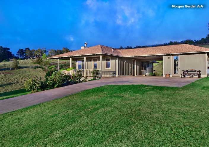 This house on a 2-acre property in rural Maui, Hawaii, fits three bedrooms and one bath in less than 1,000 square feet while maintaining an open kitchen and living area for a spacious, functional feel.