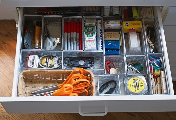 Could it be in your kitchen, mud room or laundry room? Here’s a great example of all the essentials our junk drawers seem to have inside and a great way to have them neat, tidy and ready to use at a moment’s notice. All you need are some mesh baskets to make it happen.