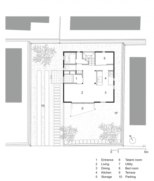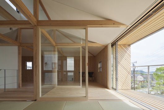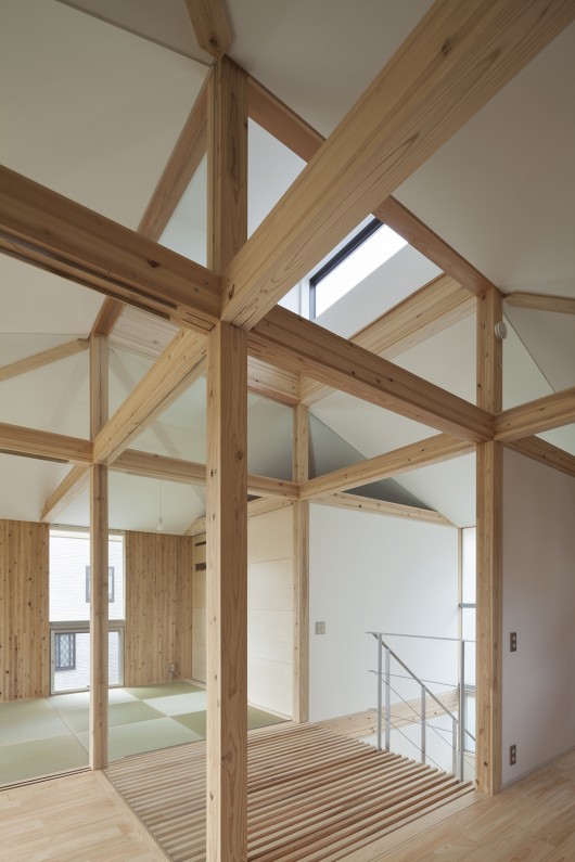 The massive exterior wall bears all horizontal loads applied to the building due to earthquake and typhoon. The interior structure is, thus, pure P&B frame, which forms the floor and roof. As consequence, the interior space could become flexible for possible future changes in room arrangement thanks to the absence of load-bearing wall inside. One of the pillars standing on the first floor is the Japanese cypress planted by the client’s grandfather and harvested by the client’s father, bringing a connection of the three generations of the family to the house.
