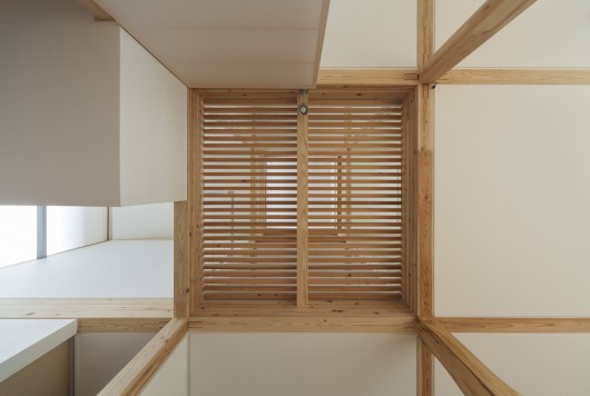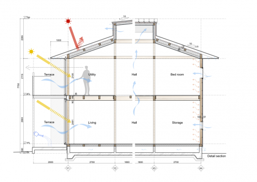 In order to absorb wood movement, the exterior wall is divided into L-shaped elements, which are standing on four corners of the house having slit between each other. The slits lead natural light and wind into the inside and give residents open feeling toward the outside. Fresh air comes in the house from every direction and the clearstory window located in the centre of the roof accelerates indoor natural ventilation. Wooden folding doorsattached to the large slit on south facade act as a storm shutter (closed state) and a sunshade at dusk (open state). Although the massive wooden wall would be inferior to a standard timber framed exterior wall in terms of numerical thermal performance (e.g. U value), here dynamic thermal/moisture buffering, thermal mass and visual/haptic/olfactory effects of that are expected to maintain the indoor climate in an appropriate manner. The roof consists of two sheets of roofing board having a thick ventilation and radiation barrier layers in between for the purpose of minimizing overhead solar radiation in summer.